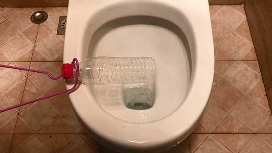 我們用做好的工具疏通馬桶看看。捏住衣架的另一端,不斷上下桶馬桶的孔洞。由于塑膠瓶空洞,上下的力能增大水流的壓力,從而達到疏通馬桶的效果。