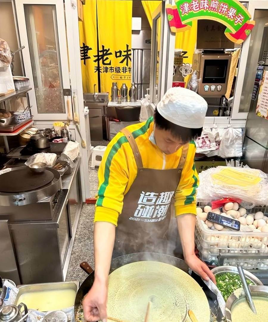 「津老味」煎餅果子店,營業時間從早上6點一直到晚上24點,無論是早餐還是夜宵,都是市民們的首選,這家店的煎餅果子分量大得令人驚訝,而且口感鮮美,讓人回味無窮。